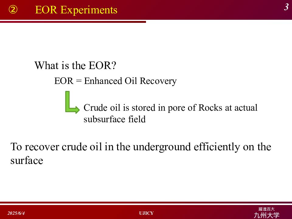 2025/6/4 UJICY ② EOR Experiments What is the EOR? EOR = Enhanced Oil Recovery Crude oil is stored in pore of Rocks at actual subsurface field To recover crude oil in the underground efficiently on the surface