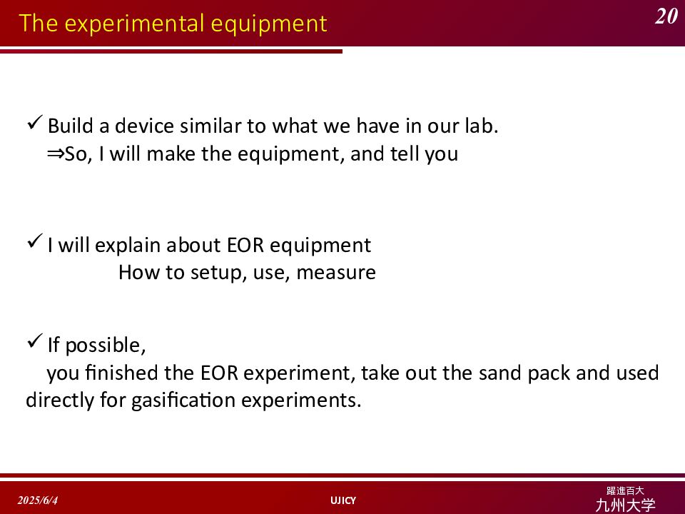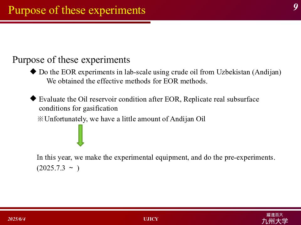 2025/6/4 UJICY Purpose of these experiments Purpose of these experiments Do the EOR experiments in lab-scale using crude oil from Uzbekistan (Andijan) We obtained the effective methods for EOR methods. Evaluate the Oil reservoir condition after EOR, Replicate real subsurface conditions for gasification ※Unfortunately, we have a little amount of Andijan Oil In this year, we make the experimental equipment, and do the pre-experiments. (2025.7.3 ~ )