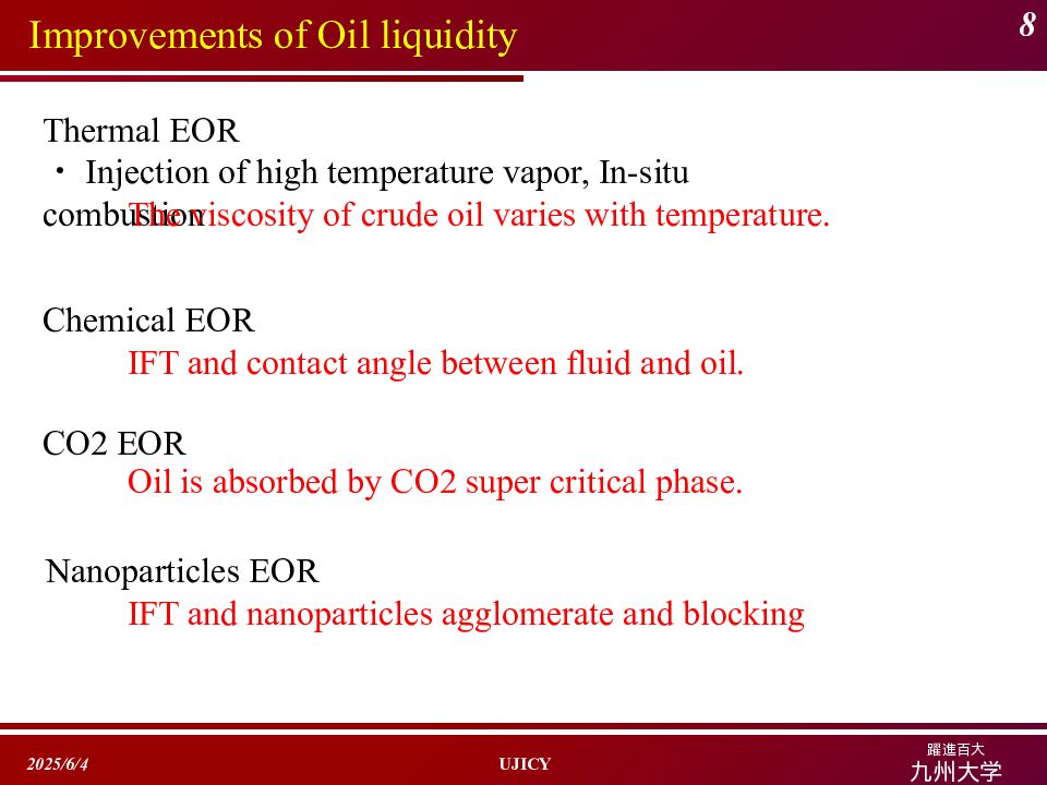 2025/6/4 UJICY Improvements of Oil liquidity Thermal EOR ・ Injection of high temperature vapor, In-situ combustion The viscosity of crude oil varies with temperature. Chemical EOR IFT and contact angle between fluid and oil. CO2 EOR Oil is absorbed by CO2 super critical phase. Nanoparticles EOR IFT and nanoparticles agglomerate and blocking