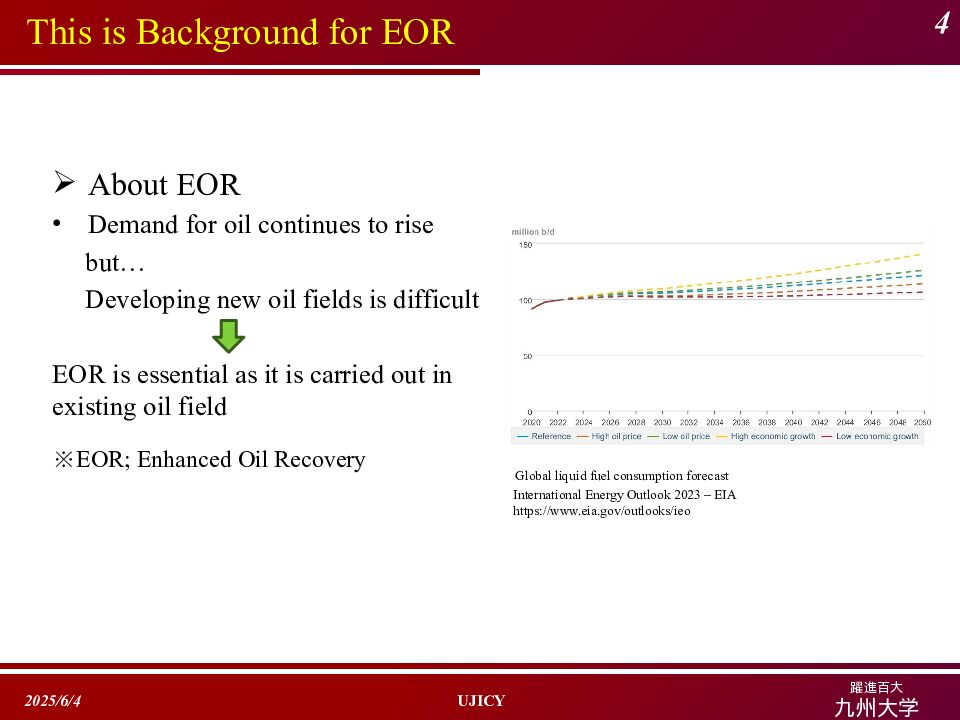 2025/6/4 UJICY About EOR Demand for oil continues to rise but… Developing new oil fields is difficult EOR is essential as it is carried out in existing oil field ※EOR; Enhanced Oil Recovery Global liquid fuel consumption forecast International Energy Outlook 2023 – EIA https://www.eia.gov/outlooks/ieo 研究背景 This is Background for EOR