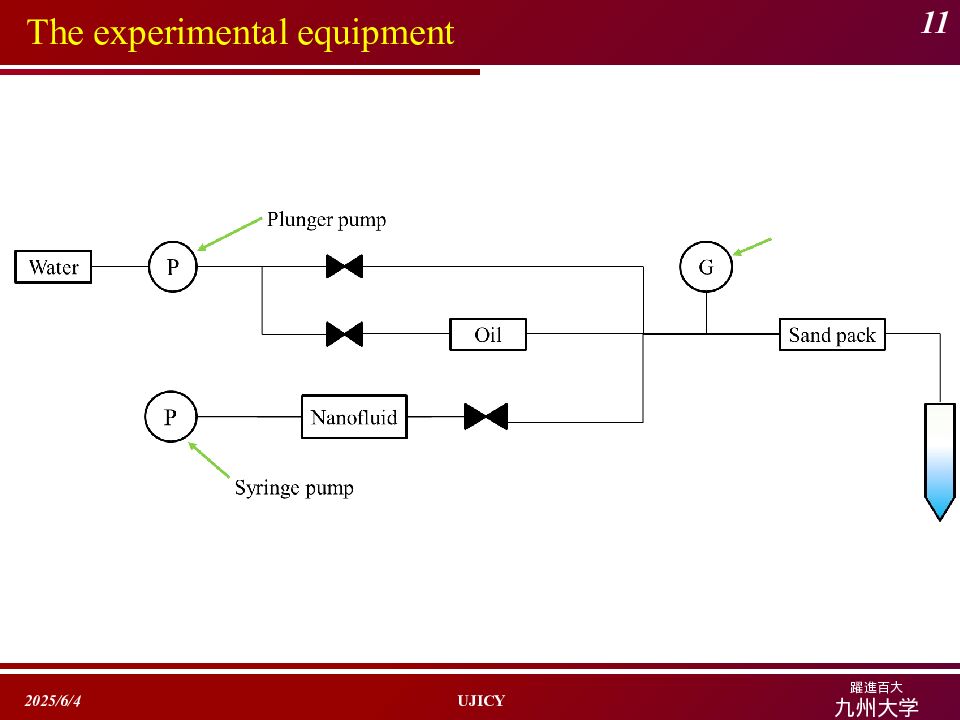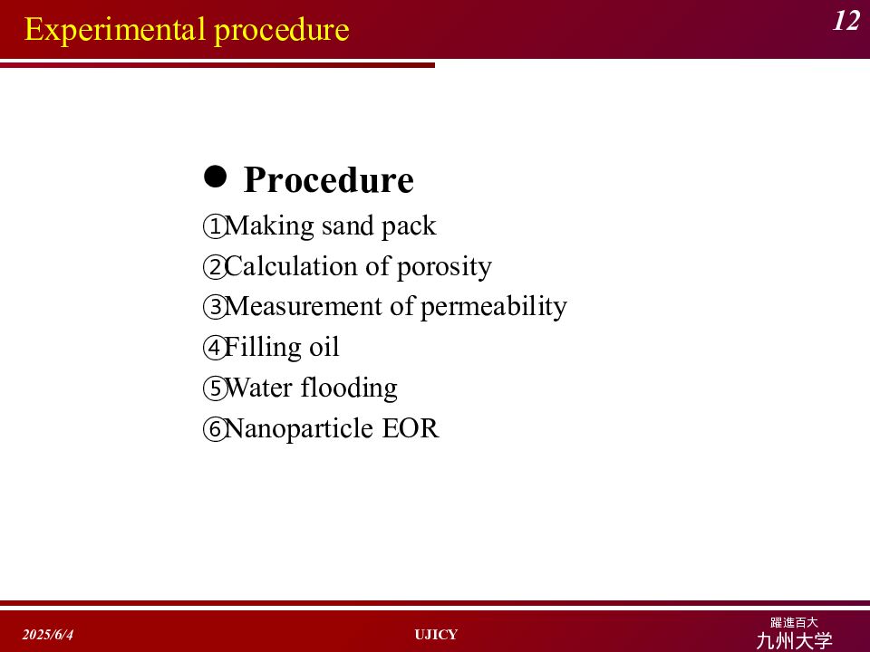2025/6/4 UJICY Procedure ① Making sand pack ② Calculation of porosity ③ Measurement of permeability ④ Filling oil ⑤ Water flooding ⑥ Nanoparticle EOR Experimental procedure