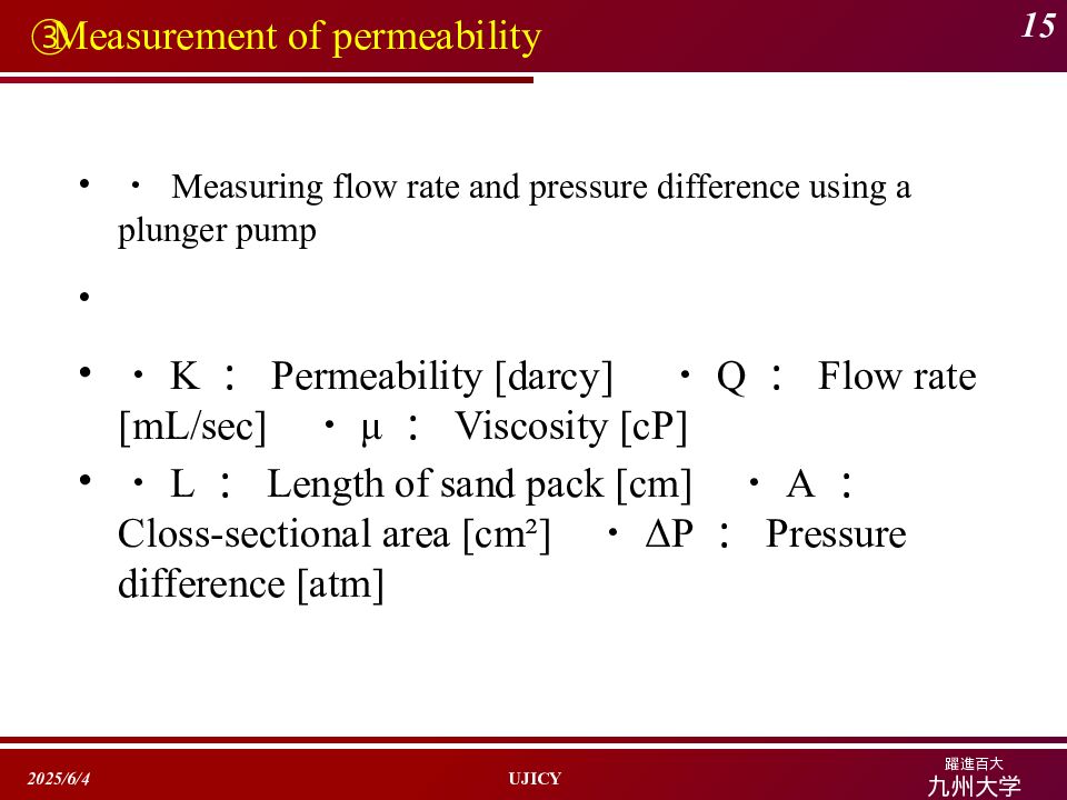 2025/6/4 UJICY ・ Measuring flow rate and pressure difference using a plunger pump ・ K : Permeability [ darcy ] ・ Q : Flow rate [mL/sec] ・ μ : Viscosity [ cP ] ・ L : Length of sand pack [cm] ・ A : Closs-sectional area [cm²] ・ ΔP : Pressure difference [atm] ③ Measurement of permeability