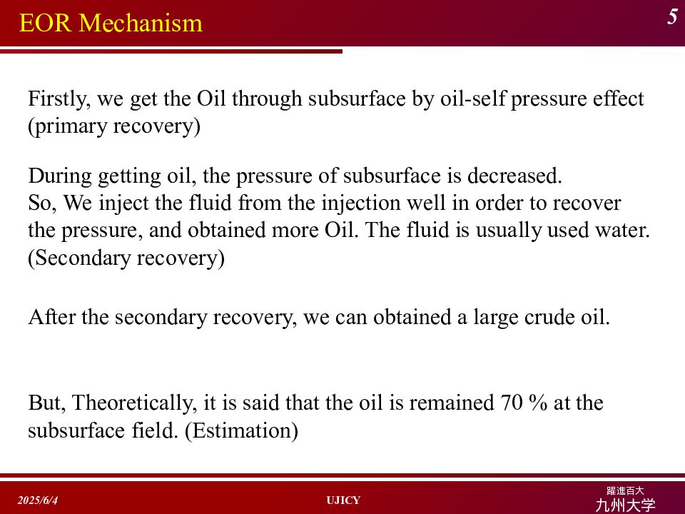 2025/6/4 UJICY EOR Mechanism Firstly, we get the Oil through subsurface by oil-self pressure effect (primary recovery) During getting oil, the pressure of subsurface is decreased. So, We inject the fluid from the injection well in order to recover the pressure, and obtained more Oil. The fluid is usually used water. (Secondary recovery) After the secondary recovery, we can obtained a large crude oil. But, Theoretically, it is said that the oil is remained 70 % at the subsurface field. (Estimation)