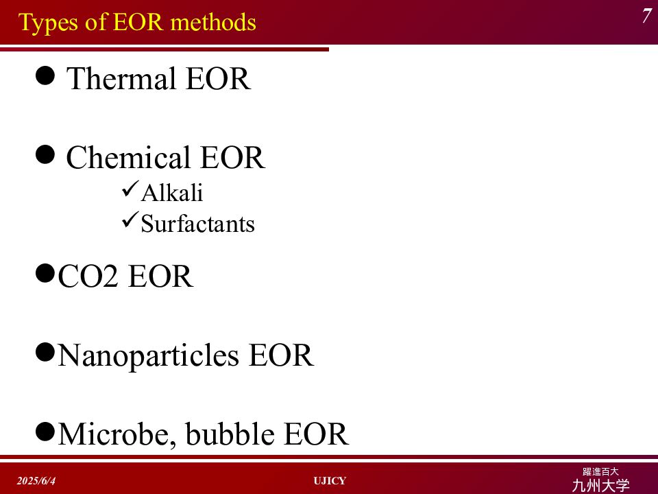 2025/6/4 UJICY Types of EOR methods Thermal EOR Chemical EOR CO2 EOR Nanoparticles EOR Microbe, bubble EOR Alkali Surfactants