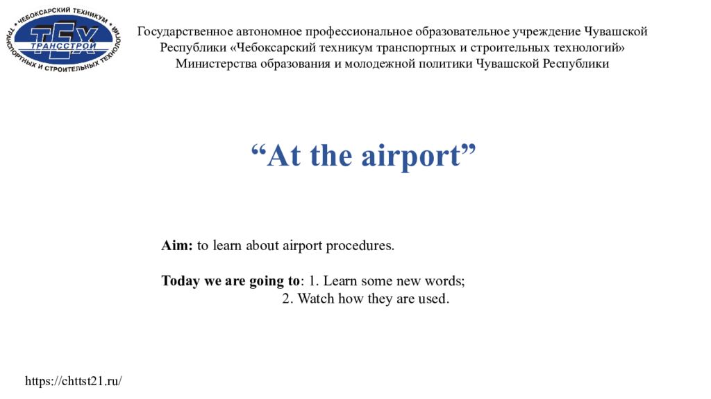 https://chttst21.ru/ Государственное автономное профессиональное образовательное учреждение Чувашской Республики «Чебоксарский техникум транспортных и строительных технологий» Министерства образования и молодежной политики Чувашской Республики Aim: to learn about airport procedures. Today we are going to : 1. Learn some new words; 2. Watch how they are used. “At the airport”
