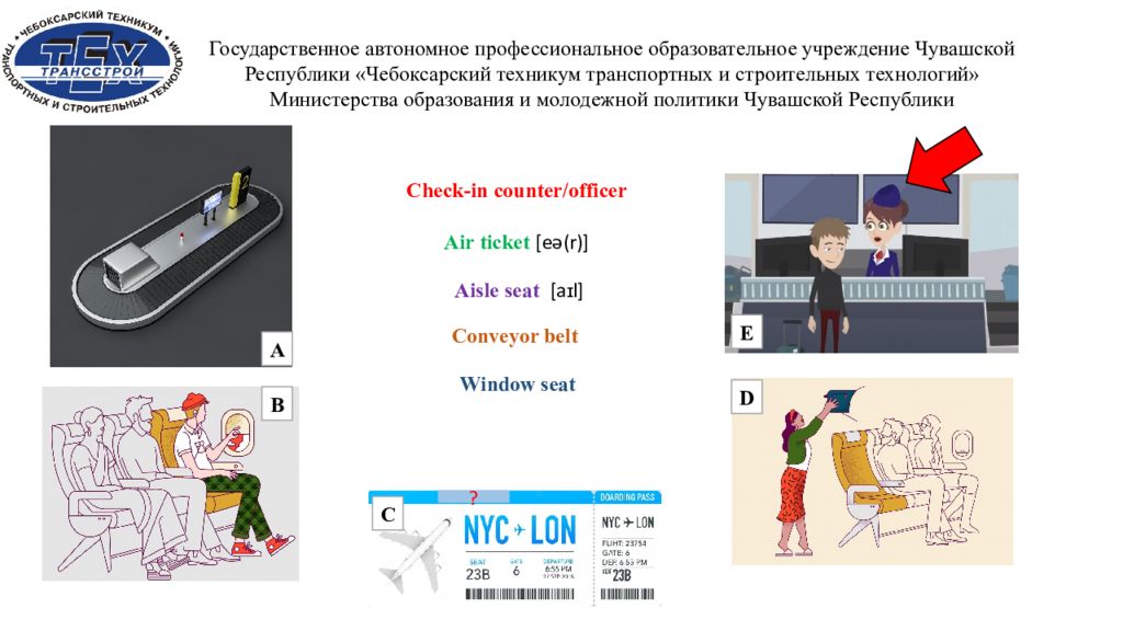 Государственное автономное профессиональное образовательное учреждение Чувашской Республики «Чебоксарский техникум транспортных и строительных технологий» Министерства образования и молодежной политики Чувашской Республики Check-in counter/officer Air ticket [ eə (r)] Aisle seat [ aɪl ] Window seat Conveyor belt A B ? C D E