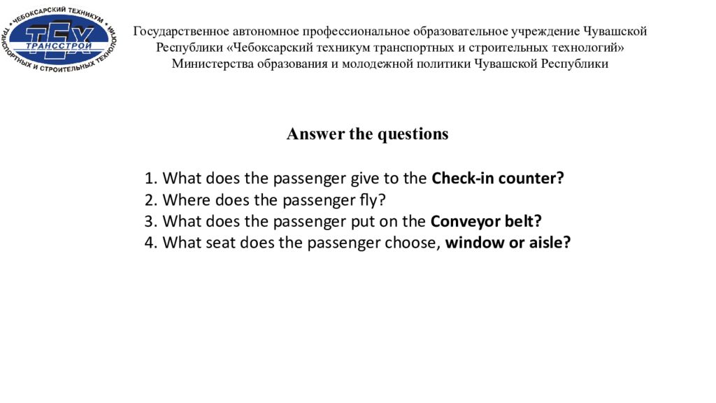 Государственное автономное профессиональное образовательное учреждение Чувашской Республики «Чебоксарский техникум транспортных и строительных технологий» Министерства образования и молодежной политики Чувашской Республики Answer the questions 1. What does the passenger give to the Check-in counter? 2. Where does the passenger fly? 3. What does the passenger put on the Conveyor belt? 4. What seat does the passenger choose, window or aisle?
