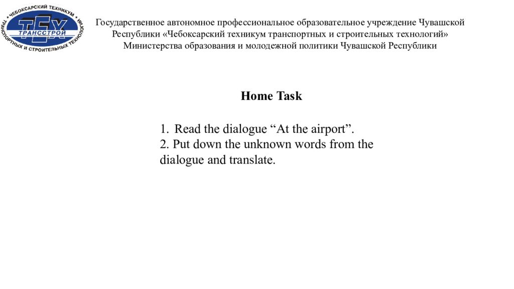 Государственное автономное профессиональное образовательное учреждение Чувашской Республики «Чебоксарский техникум транспортных и строительных технологий» Министерства образования и молодежной политики Чувашской Республики Home Task Read the dialogue “At the airport”. 2. Put down the unknown words from the dialogue and translate.