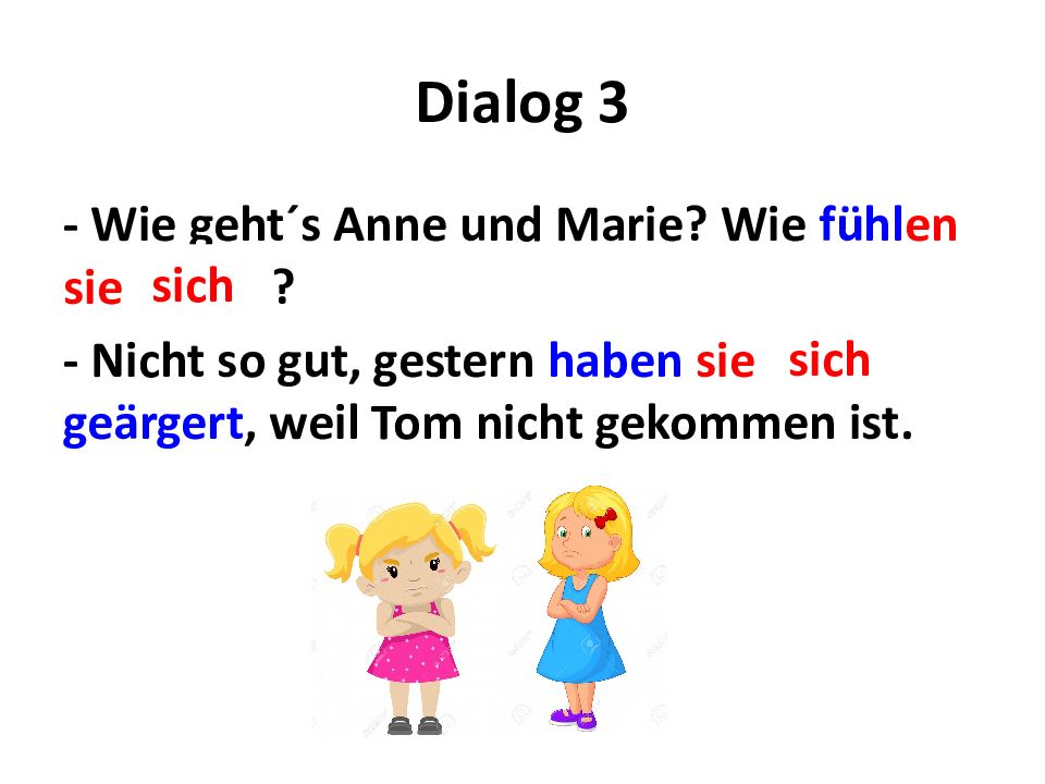 - Wie geht´s Anne und Marie? Wie fühl en sie... ? - Nicht so gut, gestern haben sie... geärgert, weil Tom nicht gekommen ist. sich sich