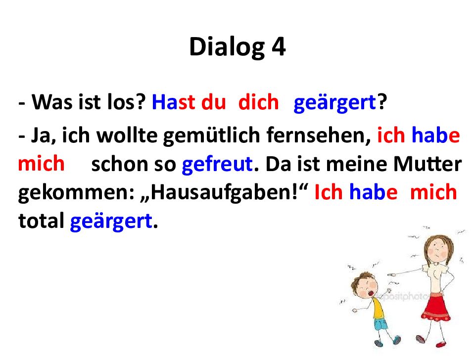 - Was ist los? Ha st du... geärgert ? - Ja, ich wollte gemütlich fernsehen, ich hab e... schon so gefreut. Da ist meine Mutter gekommen: „Hausaufgaben!“ Ich hab e... total geärgert. dich mich mich