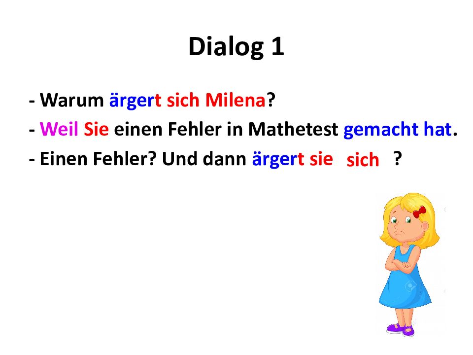 - Warum ärger t sich Milena ? - Weil Sie einen Fehler in Mathetest gemacht hat. - Einen Fehler? Und dann ärger t sie... ? sich