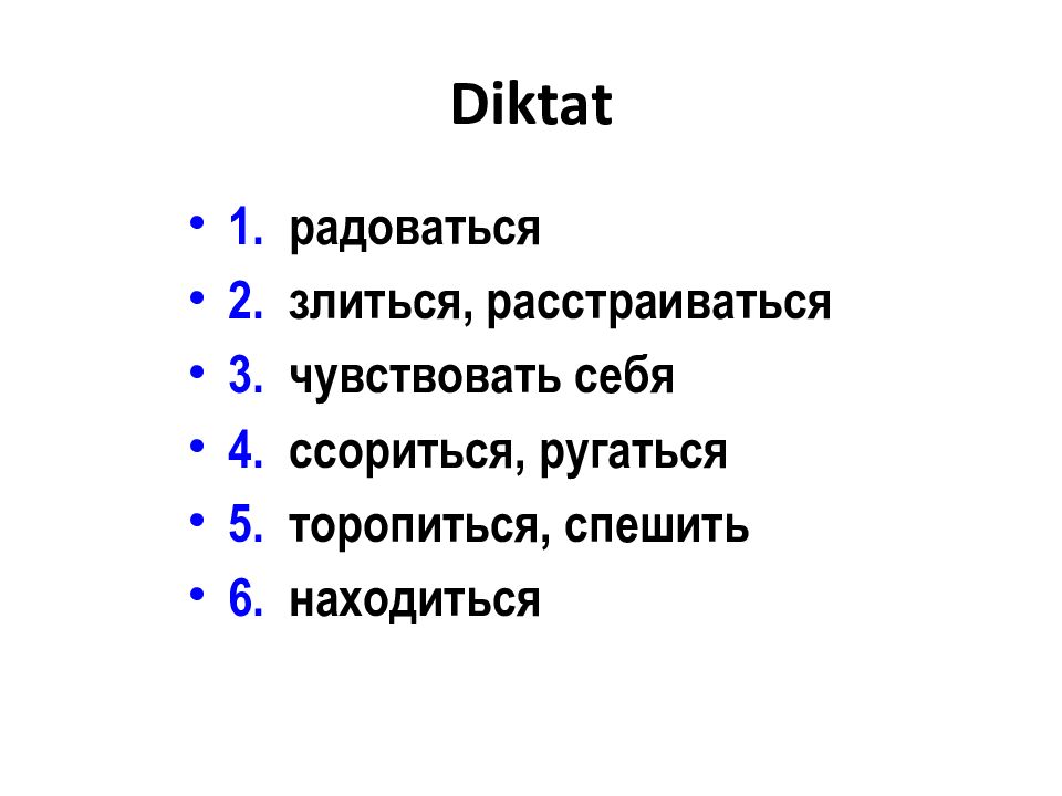 1. радоваться 2. злиться, расстраиваться 3. чувствовать себя 4. ссориться, ругаться 5. торопиться, спешить 6. находиться