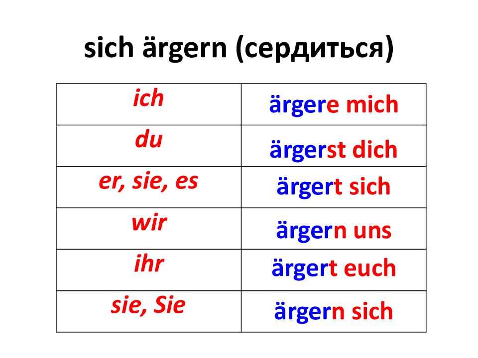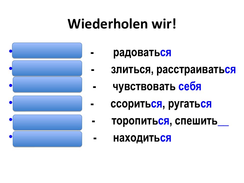 sich freuen - радовать ся sich ärgern - злиться, расстраивать ся sich fühlen - чувствовать себя sich streiten - ссорить ся, ругать ся sich be ei len - торопить ся, спешить __ sich befinden - находить ся