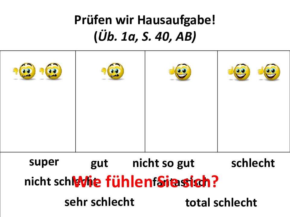 Слайд 4: Prüfen wir Hausaufgabe! ( Üb. 1a, S. 40, AB)