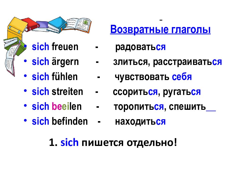sich freuen - радовать ся sich ärgern - злиться, расстраивать ся sich fühlen - чувствовать себя sich streiten - ссорить ся, ругать ся sich be ei len - торопить ся, спешить __ sich befinden - находить ся 1. sich пишется отдельно!