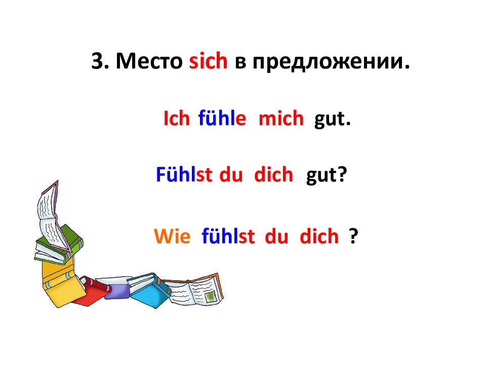 3. Место sich в предложении. Ich fühl e mich gut. Wie fühl st du dich Fühl st dich du gut? ?