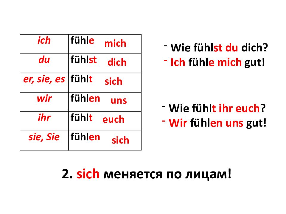 ich fühl e du fühl st er, sie, es fühl t wir fühl en ihr fühl t sie, Sie fühl en Wie fühl st du dich? Ich fühl e mich gut! Wie fühl t ihr euch ? Wir fühl en uns gut! mich dich sich uns euch sich 2. sich меняется по лицам!