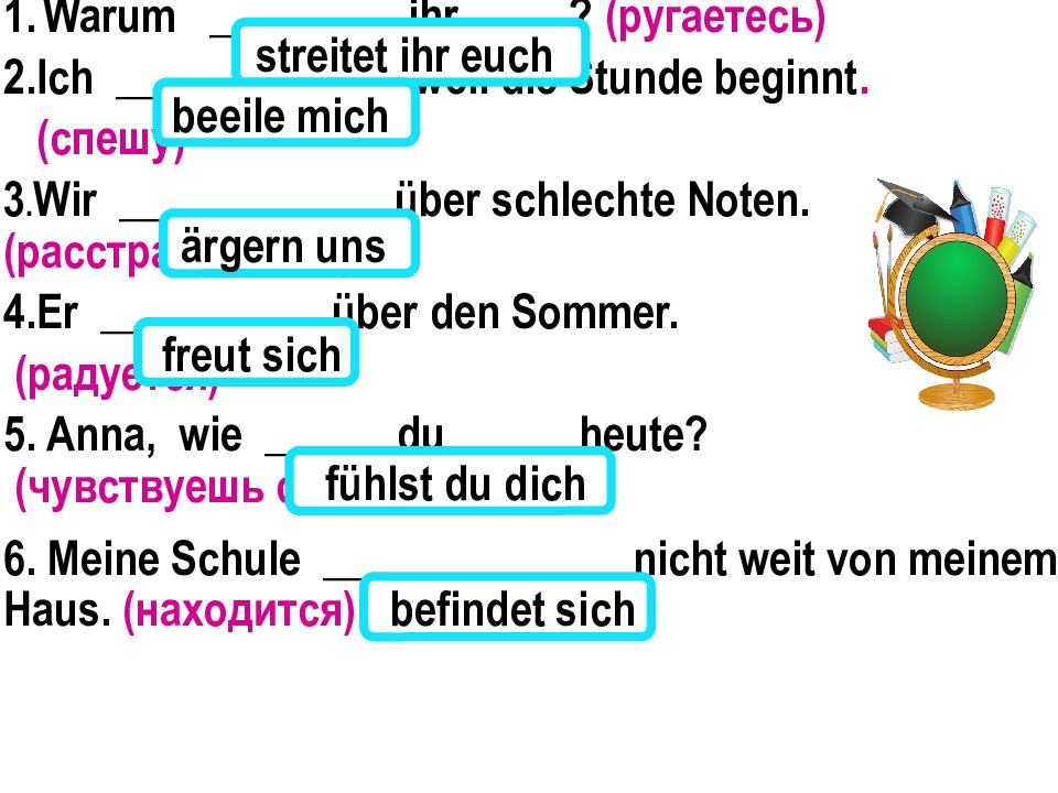 Warum ________ ihr ___ ? ( ругаетесь ) 2.Ich ______ ____, weil die Stunde beginnt. ( спешу ) 3. Wir ____ __ _ ___ über schlechte Noten. ( расстраиваемся ) 4.Er ______ __ über den Sommer. ( радуется ) 5. Anna, wie _____ du ____ heute? ( чувствуешь себя ) 6. Meine Schule ________ ____ nicht weit von meinem Haus. ( находится) streitet ihr euch beeile mich ärgern uns freut sich fühlst du dich befindet sich