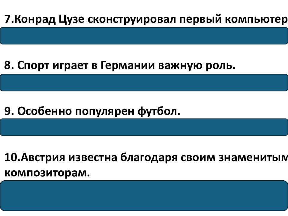 7. Конрад Цузе сконструировал первый компьютер. Konrad Zuse hat den ersten Computer konstruiert. 8. Спорт играет в Германии важную роль. Sport spielt in Deutschland eine wichtige Rolle. 9. Особенно популярен футбол. Fußball ist besonders populär. 10. Австрия известна благодаря своим знаменитым композиторам. Österreich ist durch seine weltberühmten Komponisten bekannt.