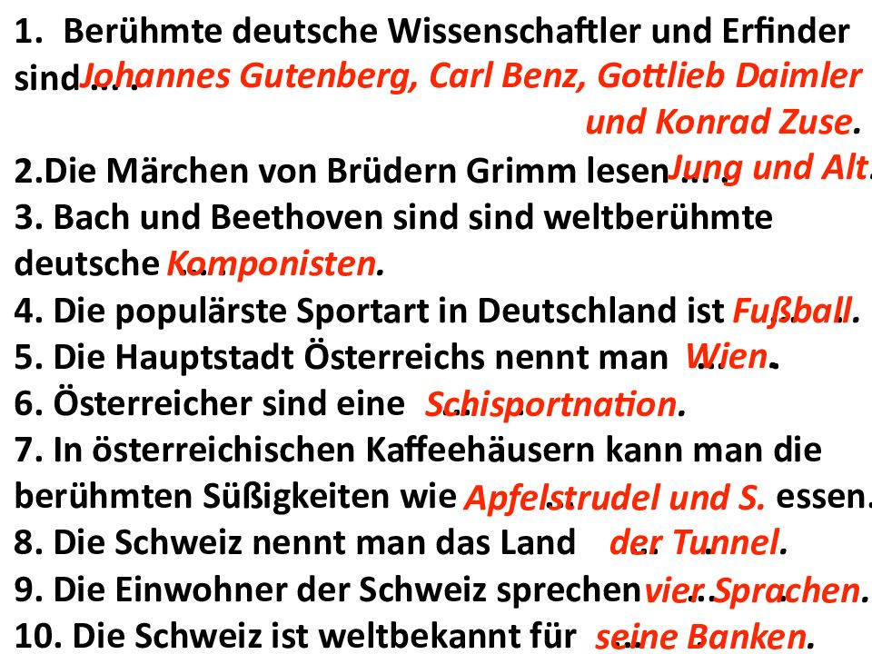Berühmte deutsche Wissenschaftler und Erfinder sind.... 2.Die Märchen von Brüdern Grimm lesen.... 3. Bach und Beethoven sind sind weltberühmte deutsche.... 4. Die populärste Sportart in Deutschland ist.... 5. Die Hauptstadt Österreichs nennt man.... 6. Österreicher sind eine.... 7. In österreichischen Kaffeehäusern kann man die berühmten Süßigkeiten wie... essen. 8. Die Schweiz nennt man das Land.... 9. Die Einwohner der Schweiz sprechen.... 10. Die Schweiz ist weltbekannt für.... Johannes Gutenberg, Carl Benz, Gottlieb Daimler und Konrad Zuse. Jung und Alt. Komponisten. Fußball. Wien. Schisportnation. Apfelstrudel und S. der Tunnel. vier Sprachen. seine Banken.