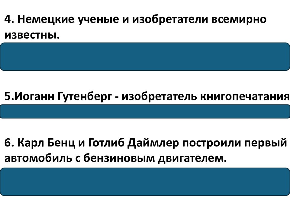 4. Немецкие ученые и изобретатели всемирно известны. Deutsche Wissenschaftler und Erfinder sind weltberühmt. 5.Иоганн Гутенберг - изобретатель книгопечатания. Johann Guttenberg ist Erfinder des Buchdrucks. 6. Карл Бенц и Готлиб Даймлер построили первый автомобиль с бензиновым двигателем. Carl Benz und Gottlieb Daimler haben das erste Auto mit dem Benzinmotor gebaut.