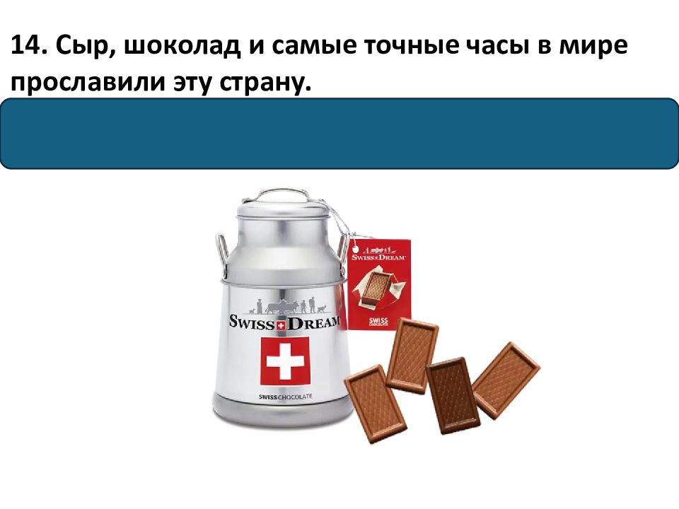 14. Сыр, шоколад и самые точные часы в мире прославили эту страну. Käse, Schokolade und die genauesten Uhren der Welt haben dieses Land weltbekannt gemacht.