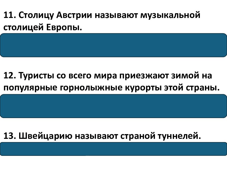 11. Столицу Австрии называют музыкальной столицей Европы. Die Hauptstadt Österreichs nennt man die musikalische Hauptstadt Europas. 12. Туристы со всего мира приезжают зимой на популярные горнолыжные курорты этой страны. Touristen aus aller Welt kommen im Winter zu populären Skikurorten dieses Landes. 13. Швейцарию называют страной туннелей. Man nennt dieses Land das Land der Tunnel.