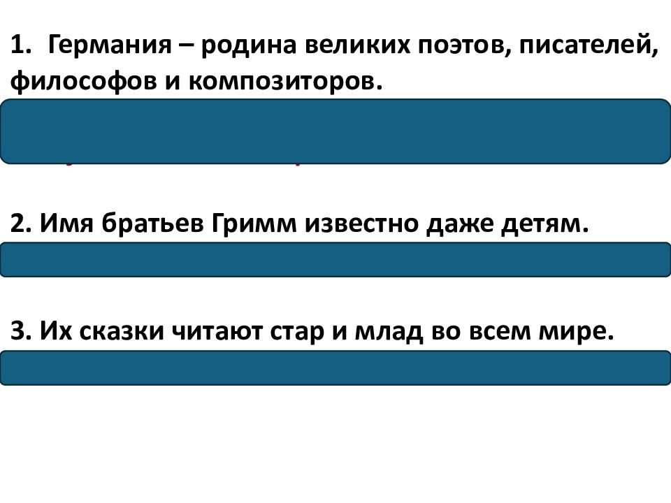 Германия – родина великих поэтов, писателей, философов и композиторов. Deutschland ist die Hauptstadt von großen Dichtern, Schriftstellern und Komponisten. 2. Имя братьев Гримм известно даже детям. Die Namen von Brüdern Grimm kennen sogar Kindern. 3. Их сказки читают стар и млад во всем мире. Ihre Märchen lesen Jung und Alt in der ganzen Welt.