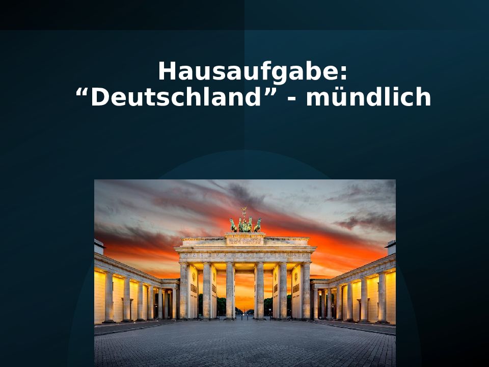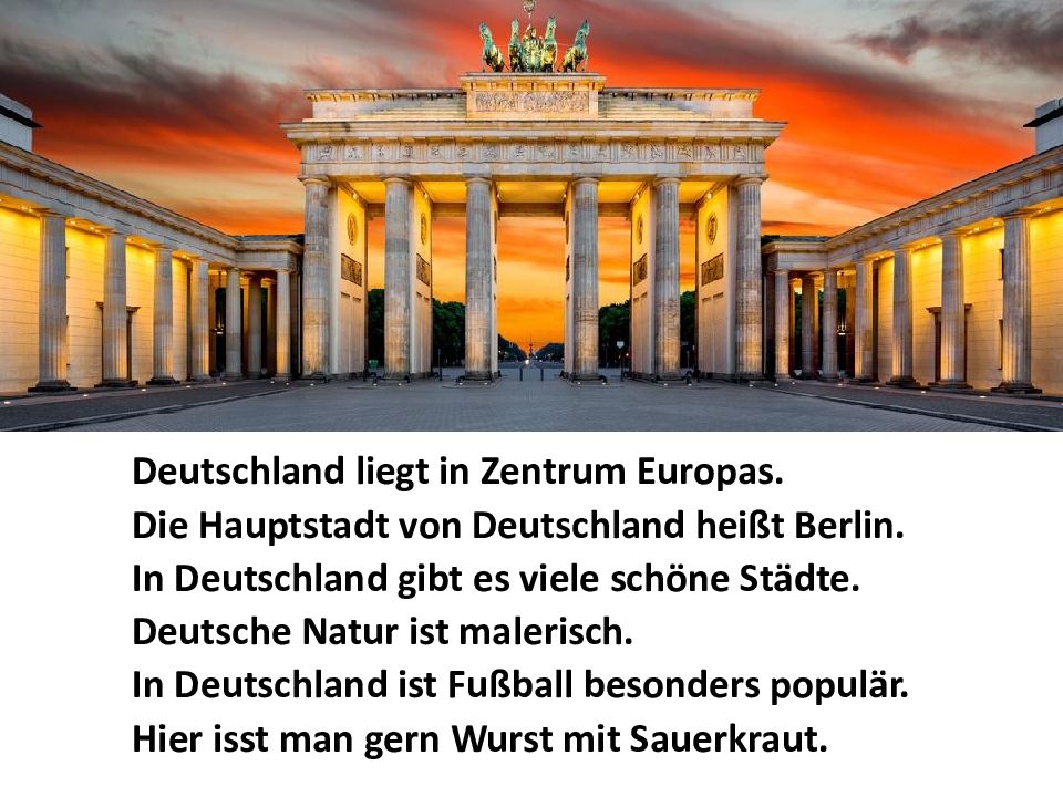 Deutschland liegt in Zentrum Europas. Die Hauptstadt von Deutschland heißt Berlin. In Deutschland gibt es viele schöne Städte. Deutsche Natur ist malerisch. In Deutschland ist Fußball besonders populär. Hier isst man gern Wurst mit Sauerkraut.