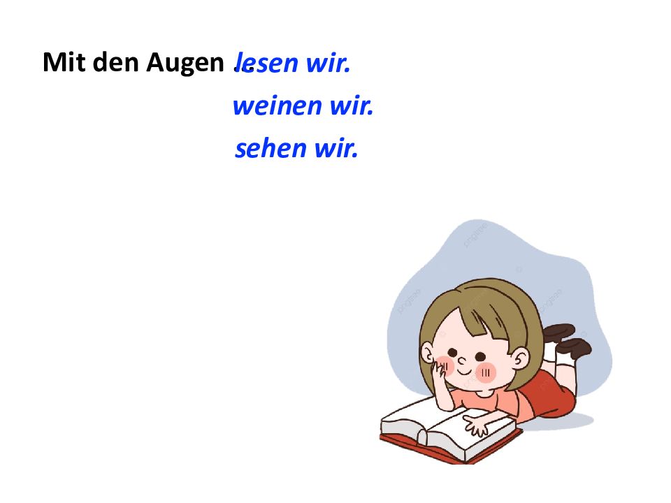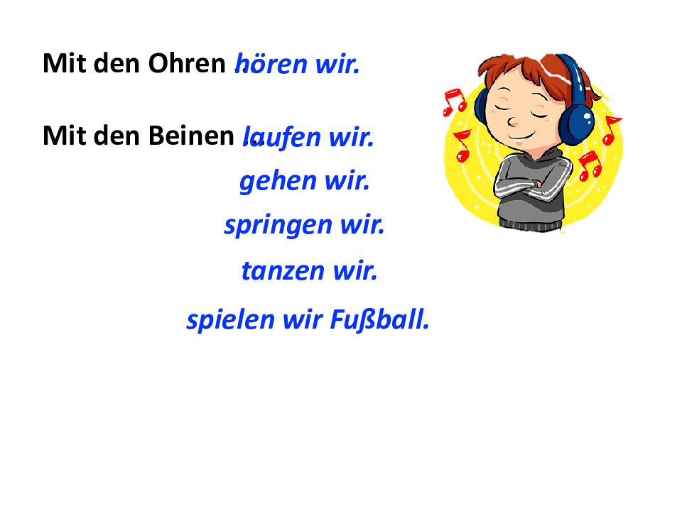 Mit den Ohren... Mit den Beinen... hören wir. laufen wir. gehen wir. springen wir. tanzen wir. spielen wir Fußball.