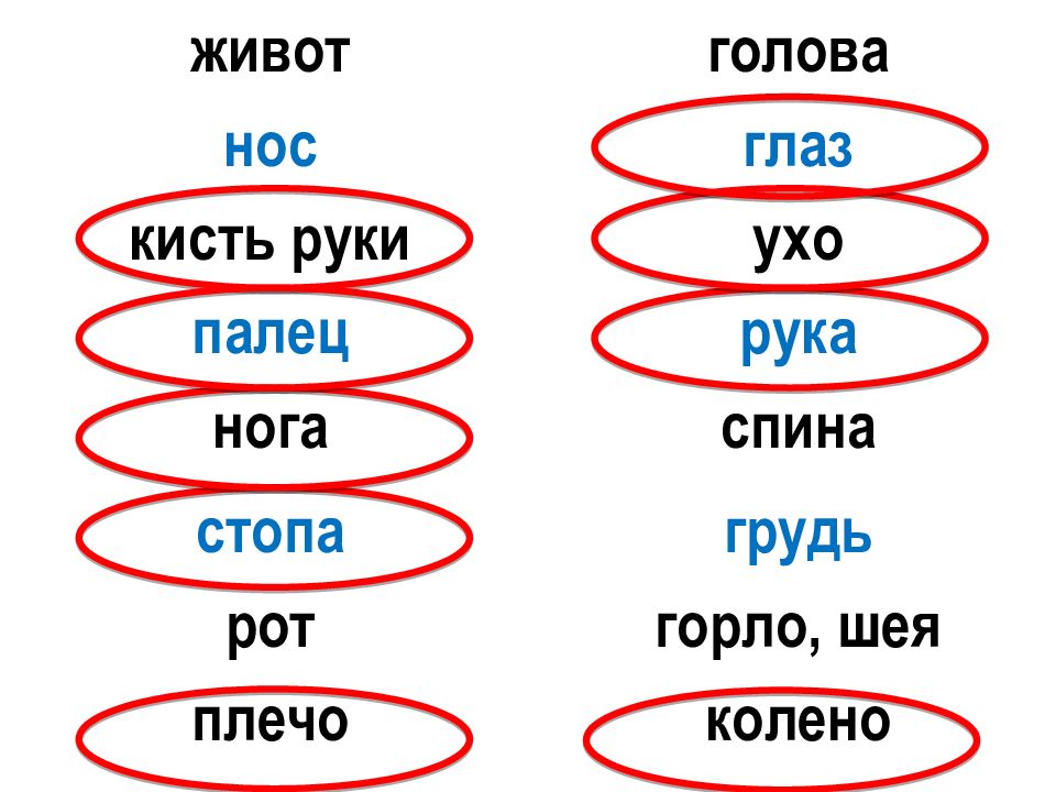 живот голова нос глаз кисть руки ухо палец рука нога спина стопа грудь рот горло, шея плечо колено