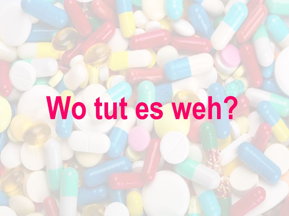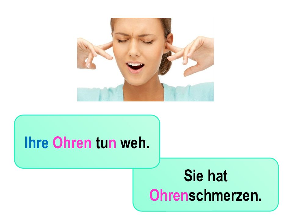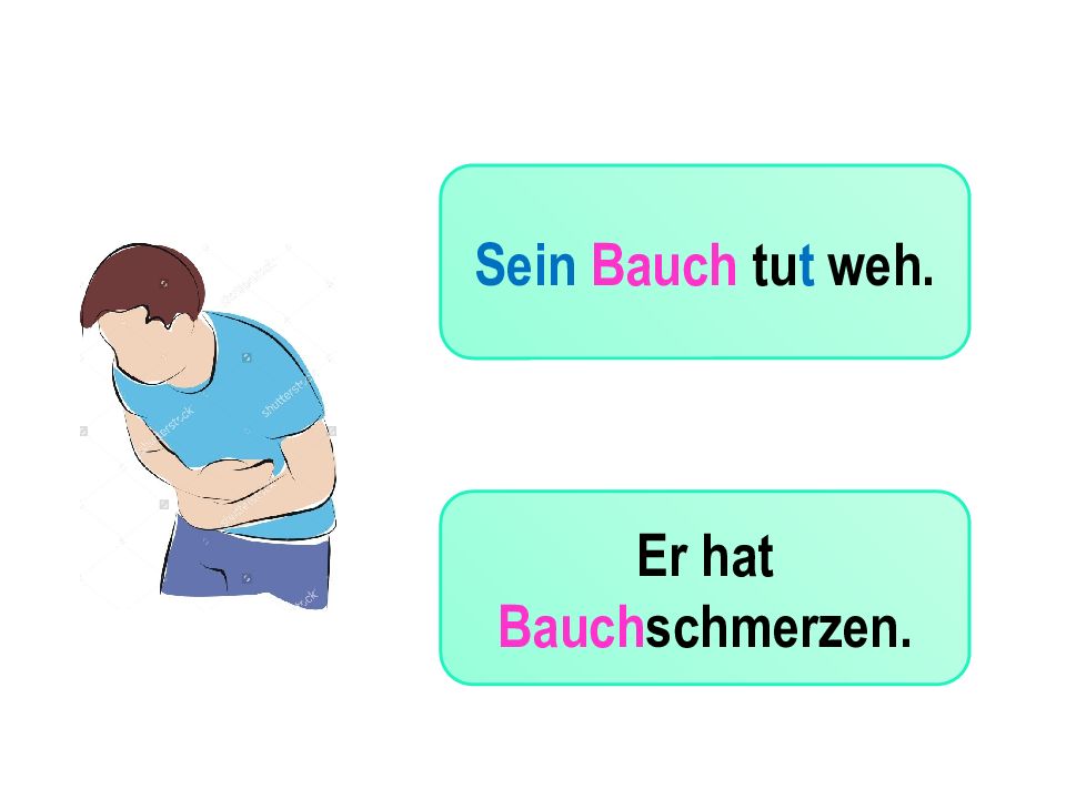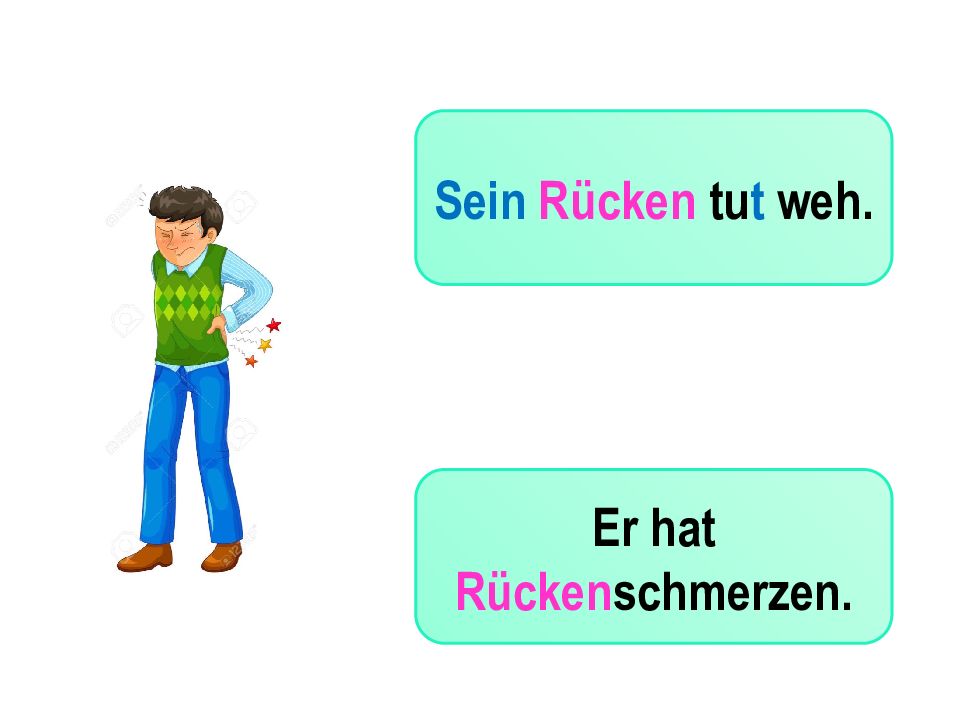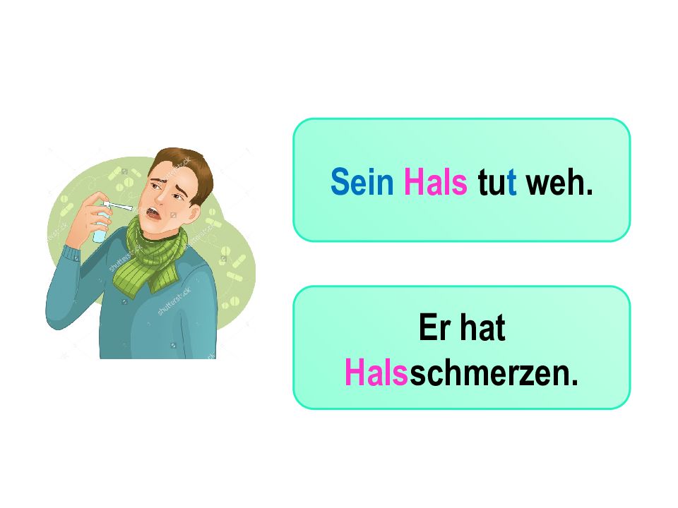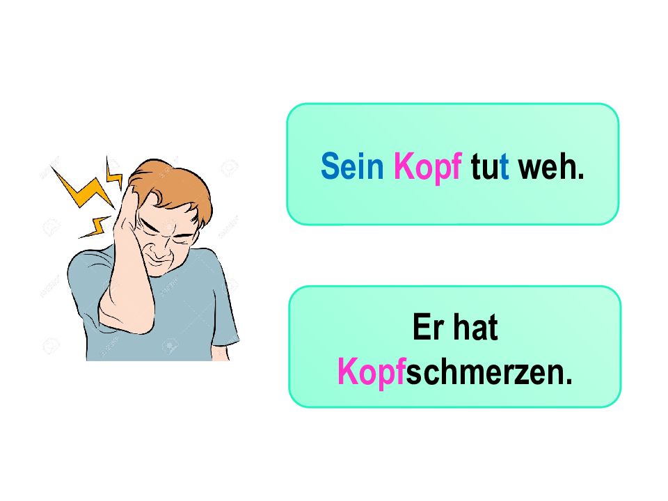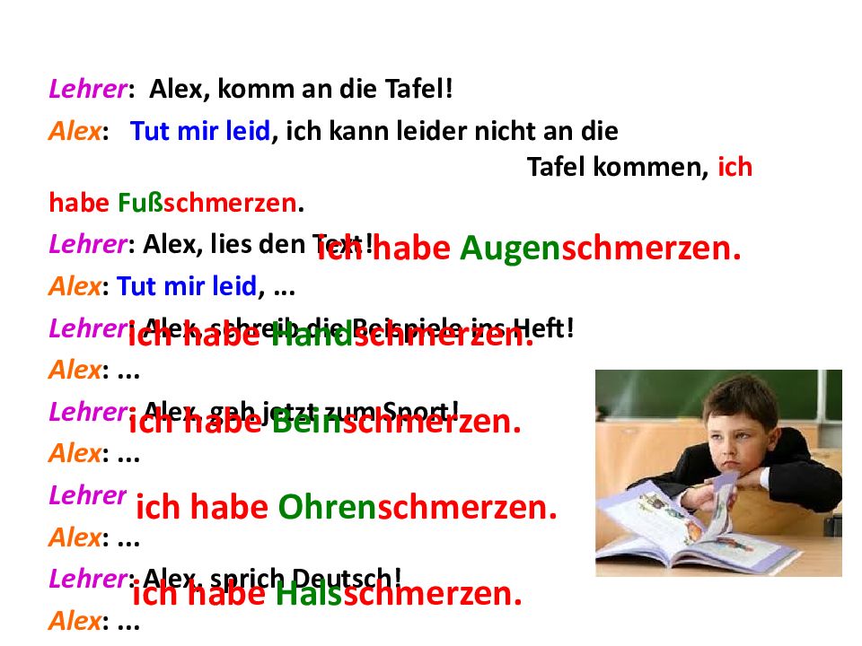Lehrer : Alex, komm an die Tafel! Alex : Tut mir leid, ich kann leider nicht an die Tafel kommen, ich habe Fuß schmerzen. Lehrer : Alex, lies den Text! Alex : Tut mir leid,... Lehrer : Alex, schreib die Beispiele ins Heft! Alex :... Lehrer : Alex, geh jetzt zum Sport! Alex :... Lehrer : Alex, hör die Interviews! Alex :... Lehrer : Alex, sprich Deutsch! Alex :... ich habe Augen schmerzen. ich habe Ohren schmerzen. ich habe Bein schmerzen. ich habe Hand schmerzen. ich habe Hals schmerzen.
