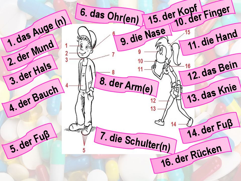 1. das Auge (n) 2. der Mund 3. der Hals 4. der Bauch 5. der Fu β 6. das Ohr(en) 7. die Schulter(n) 8. der Arm(e) 9. die Nase 10. der Finger 11. die Hand 12. das Bein 13. das Knie 15. der Kopf 14. der Fu β 16. der Rücken