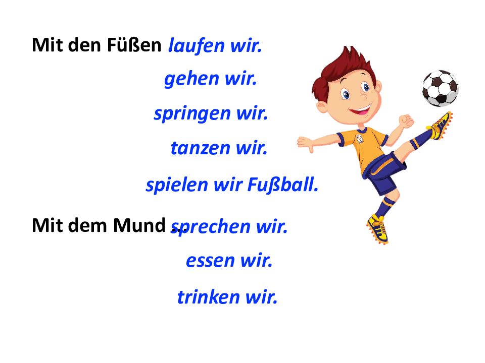 Mit den Füßen... Mit dem Mund... laufen wir. gehen wir. springen wir. tanzen wir. spielen wir Fußball. sprechen wir. essen wir. trinken wir.