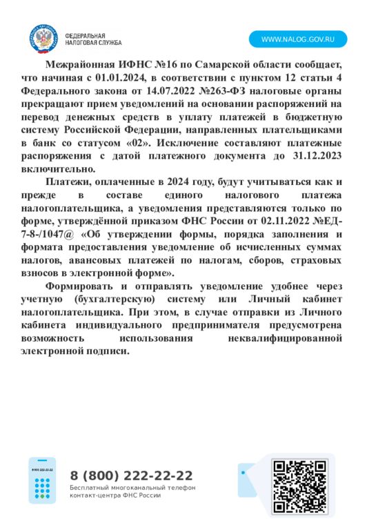 WWW.NALOG.GOV.RU 8 (800) 222-22-22 Бесплатный многоканальный телефон контакт-центра ФНС России Межрайонная ИФНС №16 по Самарской области сообщает, что начиная с 01.01.2024, в соответствии с пунктом 12 статьи 4 Федерального закона от 14.07.2022 №263-ФЗ налоговые органы прекращают прием уведомлений на основании распоряжений на перевод денежных средств в уплату платежей в бюджетную систему Российской Федерации, направленных плательщиками в банк со статусом «02». Исключение составляют платежные распоряжения с датой платежного документа до 31.12.2023 включительно. Платежи, оплаченные в 2024 году, будут учитываться как и прежде в составе единого налогового платежа налогоплательщика, а уведомления представляются только по форме, утверждённой приказом ФНС России от 02.11.2022 №ЕД-7-8-/1047@ «Об утверждении формы, порядка заполнения и формата предоставления уведомление об исчисленных суммах налогов, авансовых платежей по налогам, сборов, страховых взносов в электронной форме». Формировать и отправлять уведомление удобнее через учетную (бухгалтерскую) систему или Личный кабинет налогоплательщика. При этом, в случае отправки из Личного кабинета индивидуального предпринимателя предусмотрена возможность использования неквалифицированной электронной подписи.