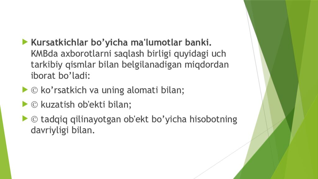 Kursatkichlar bo’yicha ma'lumotlar banki. KMBda axborotlarni saqlash birligi quyidagi uch tarkibiy qismlar bilan bеlgilanadigan miqdordan iborat bo’ladi: ko’rsatkich va uning alomati bilan; kuzatish ob'еkti bilan; tadqiq qilinayotgan ob'еkt bo’yicha hisobotning davriyligi bilan.