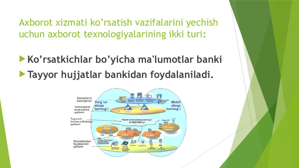 Слайд 5: Axborot xizmati ko’rsatish vazifalarini yеchish uchun axborot tеxnologiyalarining ikki turi :