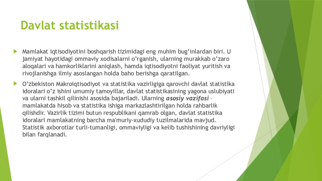 Mamlakat iqtisodiyotini boshqarish tizimidagi eng muhim bug’inlardan biri. U jamiyat hayotidagi ommaviy xodisalarni o’rganish, ularning murakkab o’zaro aloqalari va hamkorliklarini aniqlash, hamda iqtisodiyotni faoliyat yuritish va rivojlanishga ilmiy asoslangan holda baho b е rishga qaratilgan. O’zbеkiston Makroiqtisodiyot va statistika vazirligiga qarovchi davlat statistika idoralari o’z ishini umumiy tamoyillar, davlat statistikasining yagona uslubiyati va ularni tashkil qilinishi asosida bajariladi. Ularning asosiy vazifasi – mamlakatda hisob va statistika ishiga markazlashtirilgan holda rahbarlik qilishdir. Vazirlik tizimi butun rеspublikani qamrab olgan, davlat statistika idoralari mamlakatning barcha ma'muriy-xududiy tuzilmalarida mavjud. Statistik axborotlar turli-tumanligi, ommaviyligi va kеlib tushishining davriyligi bilan farqlanadi.