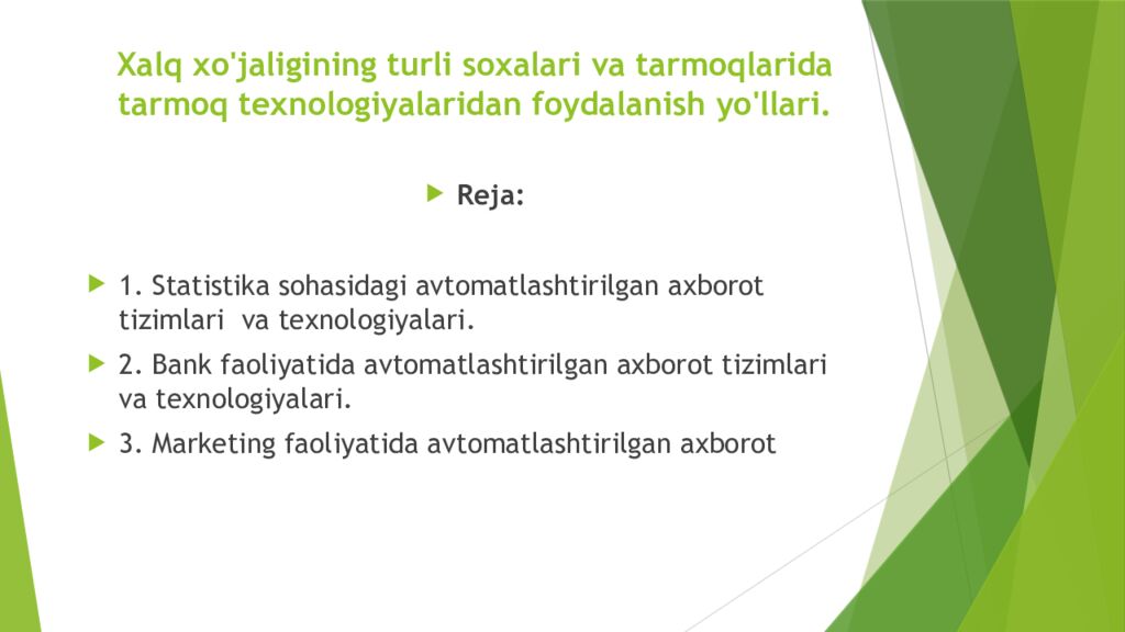 Первый слайд презентации: Xalq xo'jaligining turli soxalari va tarmoqlarida tarmoq texnologiyalaridan foydalanish yo'llari