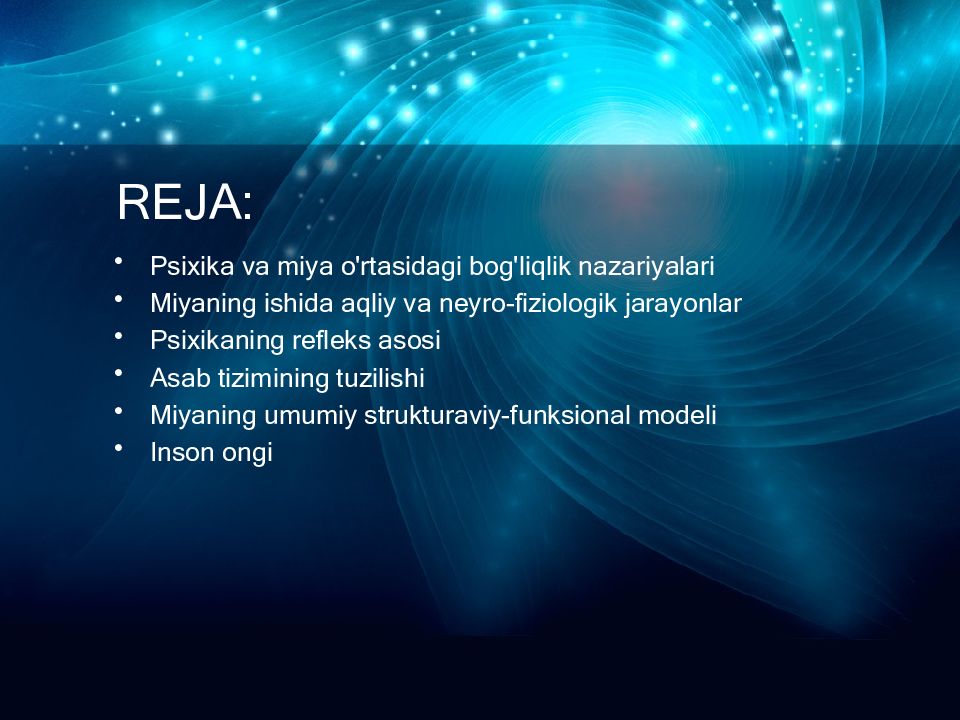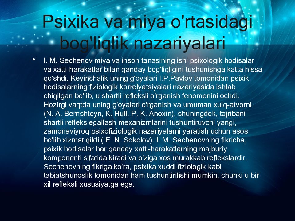 Psixika va miya o'rtasidagi bog'liqlik nazariyalari Miyaning ishida aqliy va neyro-fiziologik jarayonlar Psixikaning refleks asosi Asab tizimining tuzilishi Miyaning umumiy strukturaviy-funksional modeli Inson ongi