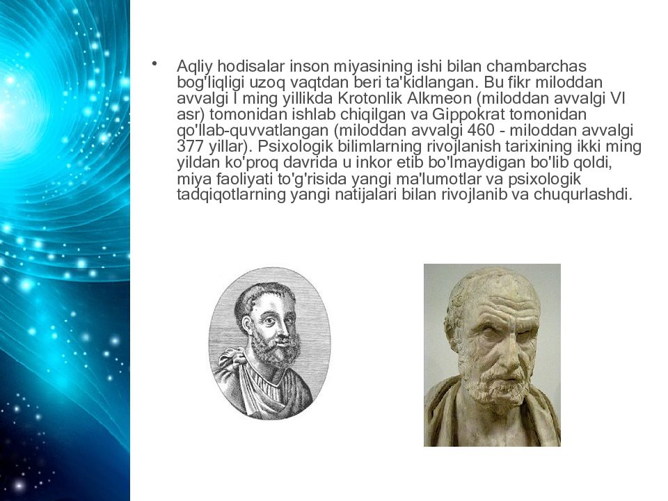 Aqliy hodisalar inson miyasining ishi bilan chambarchas bog'liqligi uzoq vaqtdan beri ta'kidlangan. Bu fikr miloddan avvalgi I ming yillikda Krotonlik Alkmeon (miloddan avvalgi VI asr) tomonidan ishlab chiqilgan va Gippokrat tomonidan qo'llab-quvvatlangan (miloddan avvalgi 460 - miloddan avvalgi 377 yillar). Psixologik bilimlarning rivojlanish tarixining ikki ming yildan ko'proq davrida u inkor etib bo'lmaydigan bo'lib qoldi, miya faoliyati to'g'risida yangi ma'lumotlar va psixologik tadqiqotlarning yangi natijalari bilan rivojlanib va chuqurlashdi.