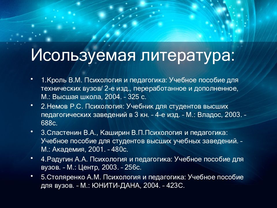 1.Кроль В.М. Психология и педагогика: Учебное пособие для технических вузов/ 2-е изд., переработанное и дополненное, М.: Высшая школа, 2004. – 325 с. 2.Немов Р.С. Психология: Учебник для студентов высших педагогических заведений в 3 кн. – 4-е изд. – М.: Владос, 2003. – 688с. 3.Сластенин В.А., Каширин В.П.Психология и педагогика: Учебное пособие для студентов высших учебных заведений. – М.: Академия, 2001. – 480с. 4.Радугин А.А. Психология и педагогика: Учебное пособие для вузов. – М.: Центр, 2003. – 256с. 5.Столяренко А.М. Психология и педагогика: Учебное пособие для вузов. – М.: ЮНИТИ-ДАНА, 2004. – 423С.
