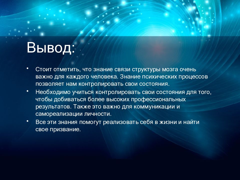 Стоит отметить, что знание связи структуры мозга очень важно для каждого человека. Знание психических процессов позволяет нам контролировать свои состояния. Необходимо учиться контролировать свои состояния для того, чтобы добиваться более высоких профессиональных результатов. Также это важно для коммуникации и самореализации личности. Все эти знания помогут реализовать себя в жизни и найти свое призвание.
