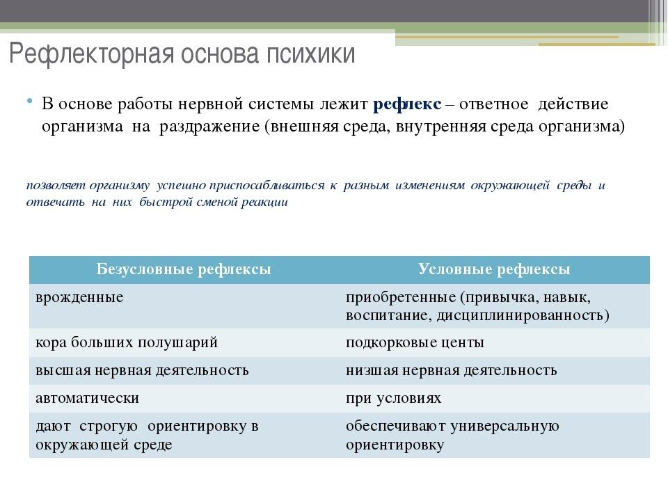 I. M. Sechenov miya va inson tanasining ishi psixologik hodisalar va xatti-harakatlar bilan qanday bog'liqligini tushunishga katta hissa qo'shdi. Keyinchalik uning g'oyalari I.P.Pavlov tomonidan psixik hodisalarning fiziologik korrelyatsiyalari nazariyasida ishlab chiqilgan bo'lib, u shartli refleksli o'rganish fenomenini ochdi. Hozirgi vaqtda uning g'oyalari o'rganish va umuman xulq-atvorni (N. A. Bernshteyn, K. Hull, P. K. Anoxin), shuningdek, tajribani shartli refleks egallash mexanizmlarini tushuntiruvchi yangi, zamonaviyroq psixofiziologik nazariyalarni yaratish uchun asos bo'lib xizmat qildi ( E. N. Sokolov). I. M. Sechenovning fikricha, psixik hodisalar har qanday xatti-harakatlarning majburiy komponenti sifatida kiradi va o'ziga xos murakkab reflekslardir. Sechenovning fikriga ko'ra, psixika xuddi fiziologik kabi tabiatshunoslik tomonidan ham tushuntirilishi mumkin, chunki u bir xil refleksli xususiyatga ega.