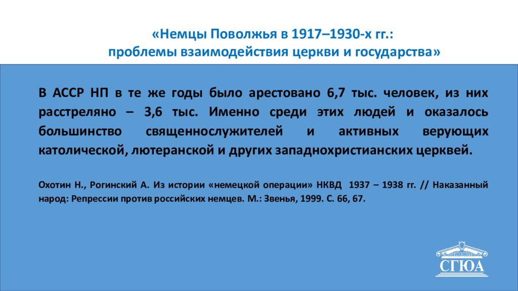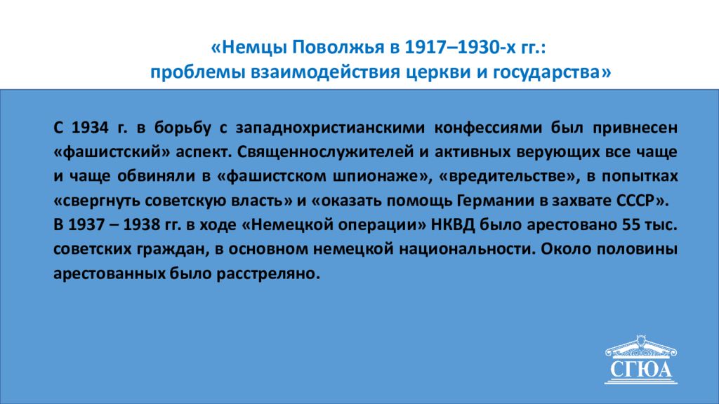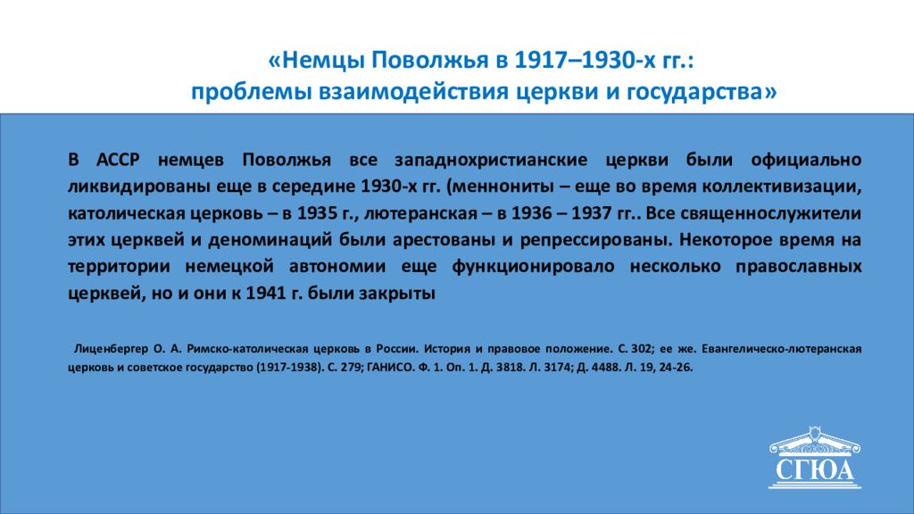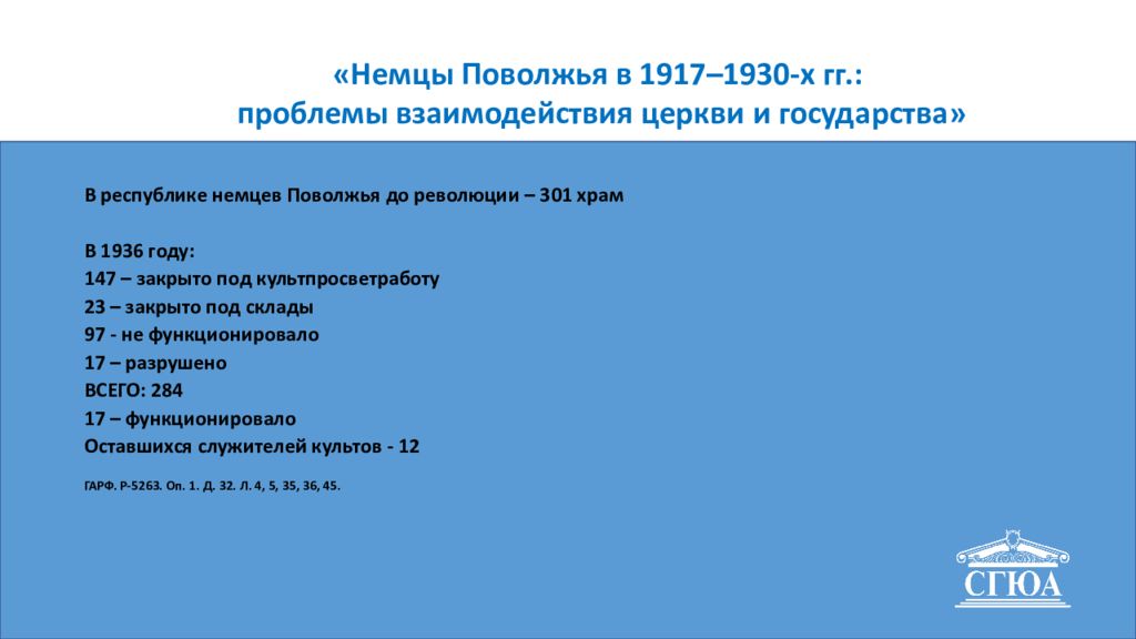 В республике немцев Поволжья до революции – 301 храм В 1936 году: 147 – закрыто под культпросветработу 23 – закрыто под склады 97 - не функционировало 17 – разрушено ВСЕГО: 284 17 – функционировало Оставшихся служителей культов - 12 ГАРФ. Р-5263. Оп. 1. Д. 32. Л. 4, 5, 35, 36, 45. «Немцы Поволжья в 1917–1930-х гг.: проблемы взаимодействия церкви и государства»