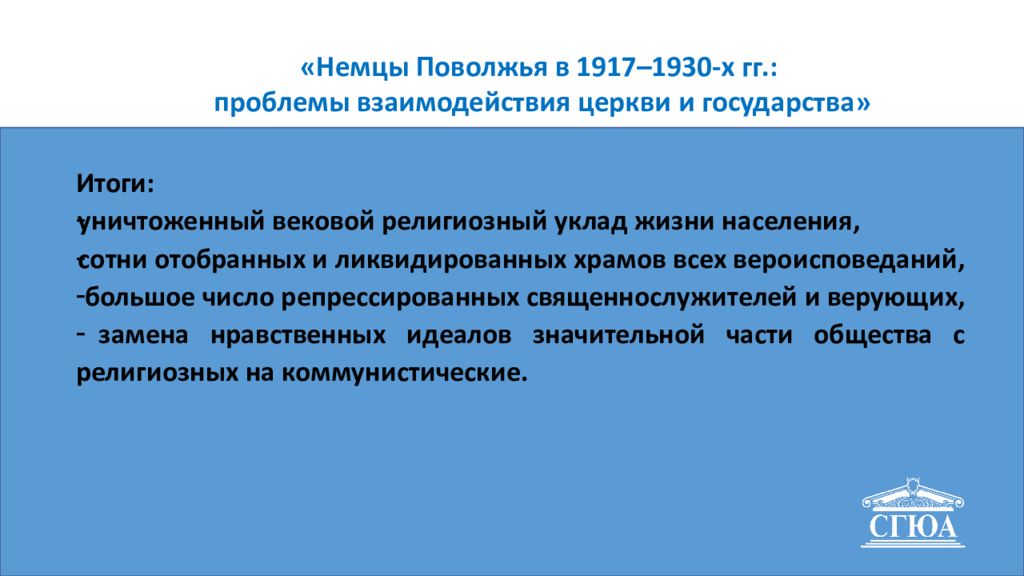 Итоги: уничтоженный вековой религиозный уклад жизни населения, сотни отобранных и ликвидированных храмов всех вероисповеданий, большое число репрессированных священнослужителей и верующих, замена нравственных идеалов значительной части общества с религиозных на коммунистические. «Немцы Поволжья в 1917–1930-х гг.: проблемы взаимодействия церкви и государства»