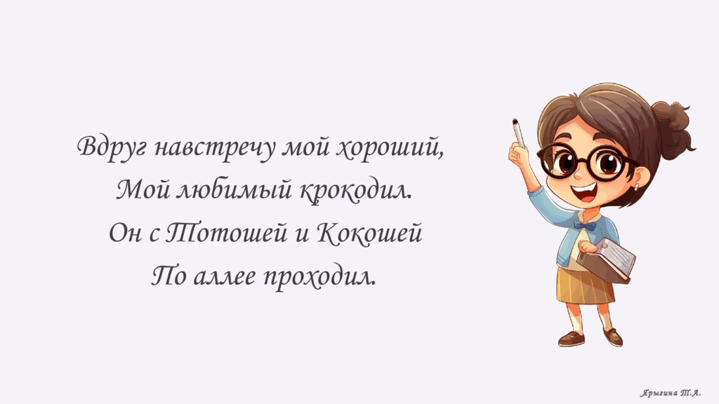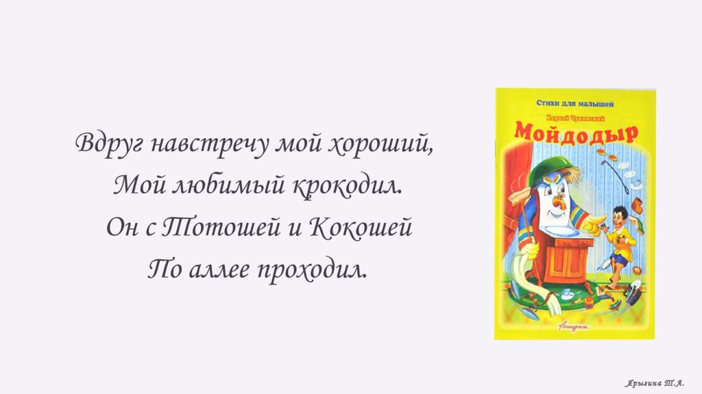 Вдруг навстречу мой хороший, Мой любимый крокодил. Он с Тотошей и Кокошей По аллее проходил. Ярыгина Т.А.