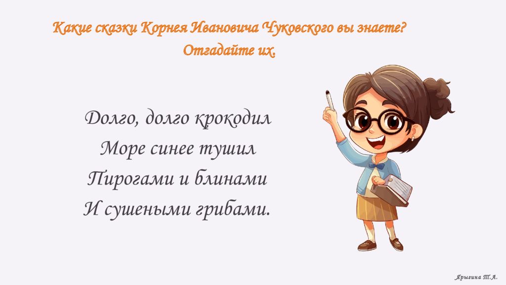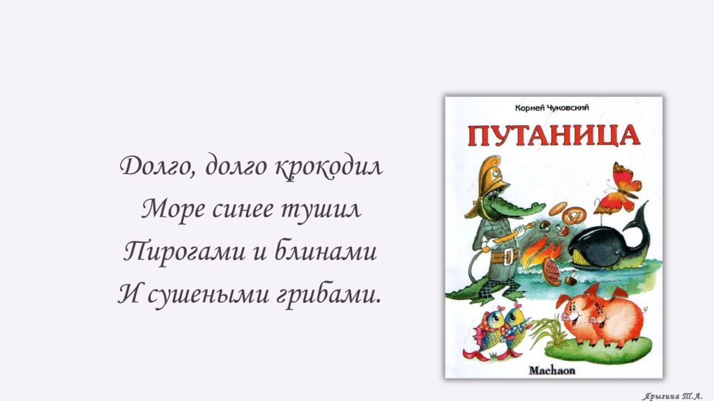 Какие сказки Корнея Ивановича Чуковского вы знаете ? Отгадайте их. Долго, долго крокодил Море синее тушил Пирогами и блинами И сушеными грибами. Ярыгина Т.А.