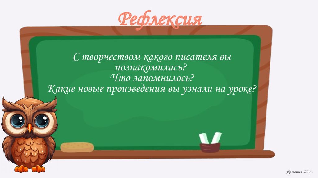 Рефлексия Ярыгина Т.А. С творчеством как ого писателя вы познакомились ? Что запомнилось ? Какие новые произведения в ы узнал и на уроке ?