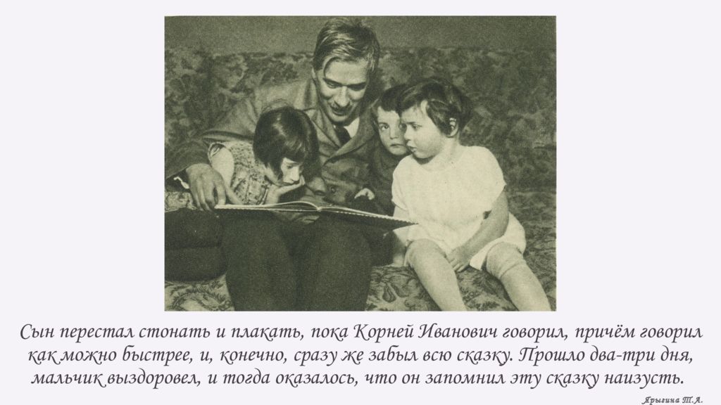 Сын перестал стонать и плакать, пока Корней Иванович говорил, причём говорил как можно быстрее, и, конечно, сразу же забыл всю сказку. Прошло два-три дня, мальчик выздоровел, и тогда оказалось, что он запомнил эту сказку наизусть. Ярыгина Т.А.